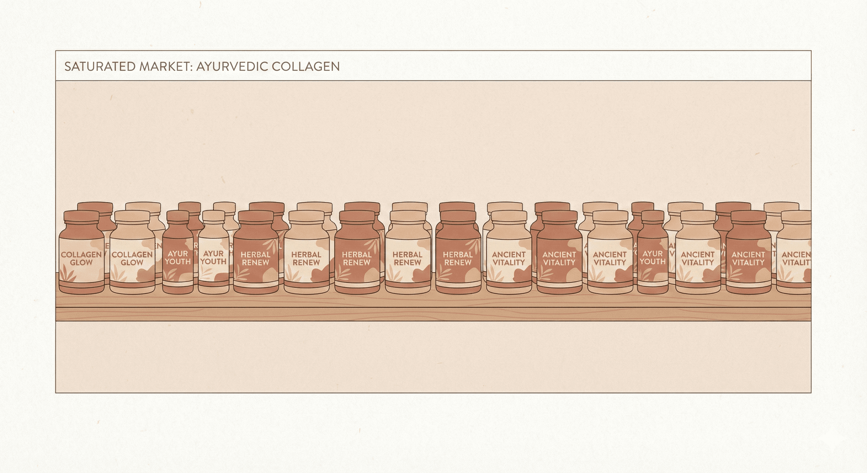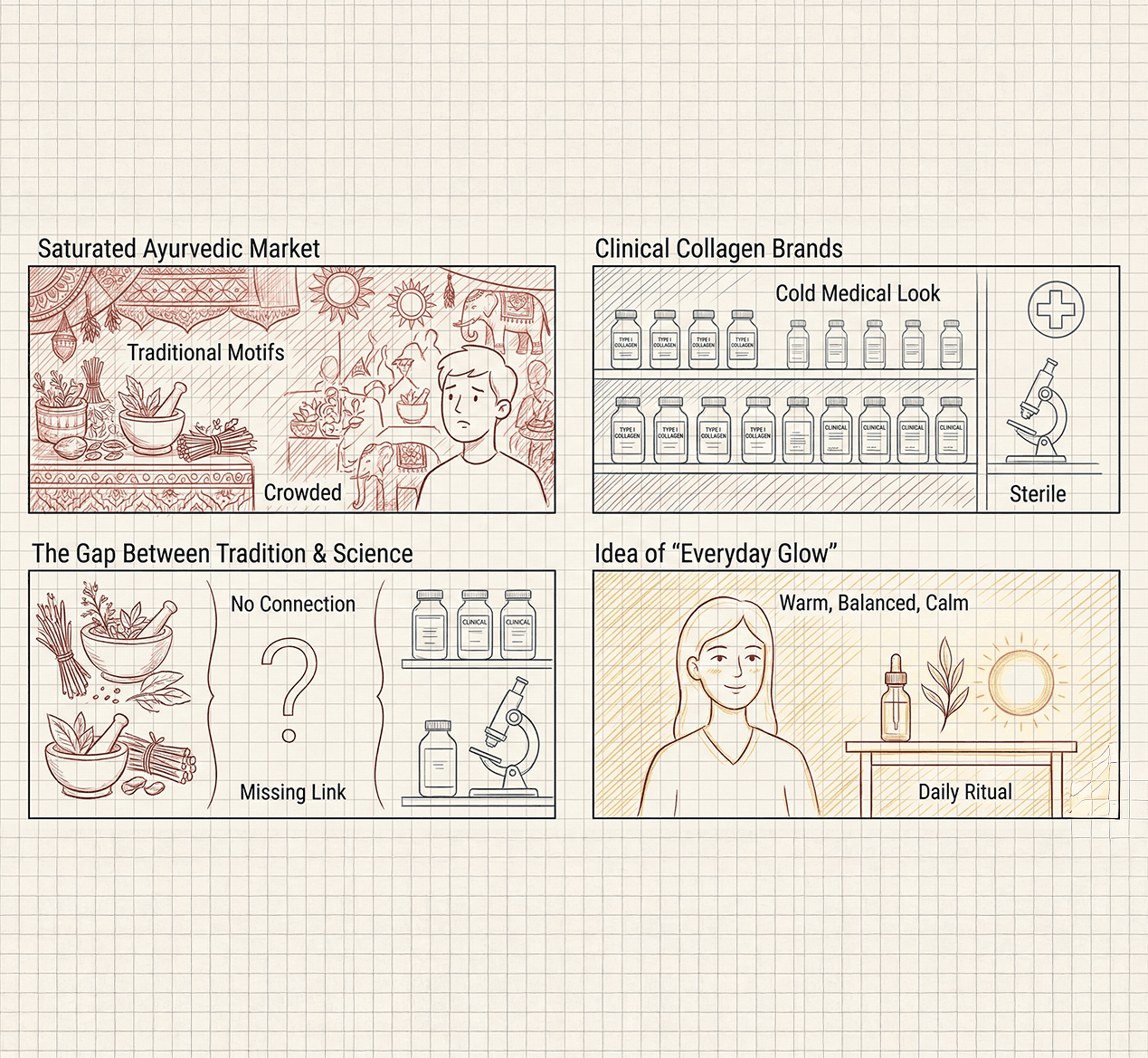 Ayurvedic beauty is crowded with traditional motifs, while collagen supplements often feel too clinical.Ekaaya needed a distinct position: warm, natural, science-aligned, and aspirational - without looking generic.